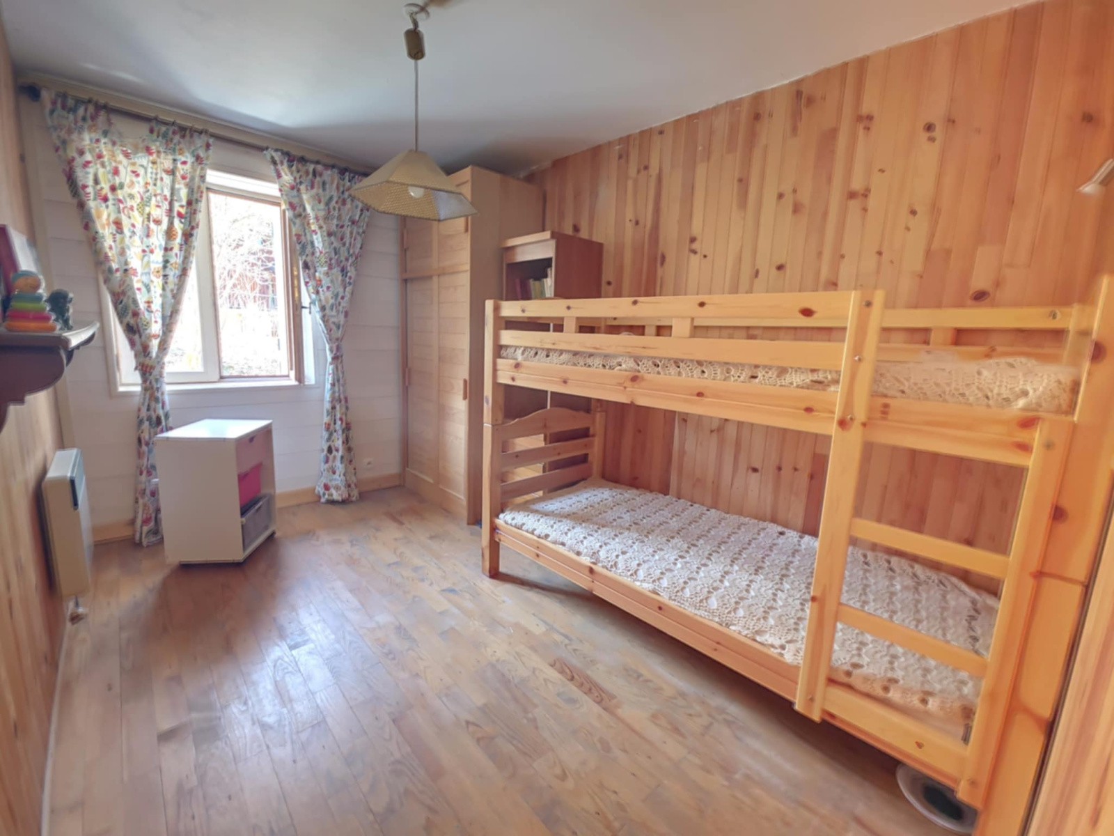 Ce chalet dispose de cinq chambres spacieuses, parfaites pour accueillir famille et amis. Le chauffage est assuré par un système électrique complété par un poêle à bois, créant une atmosphère chaleureuse et conviviale durant les soirées d’hiver. Bien que certaines menuiseries aient été récemment changées, le chalet conserve son charme traditionnel.